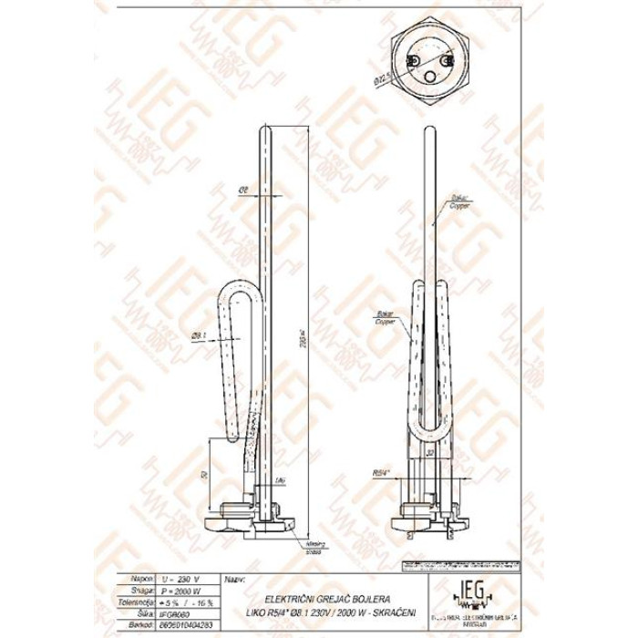 Grijač bojlera LIKO 2 kW - kratki