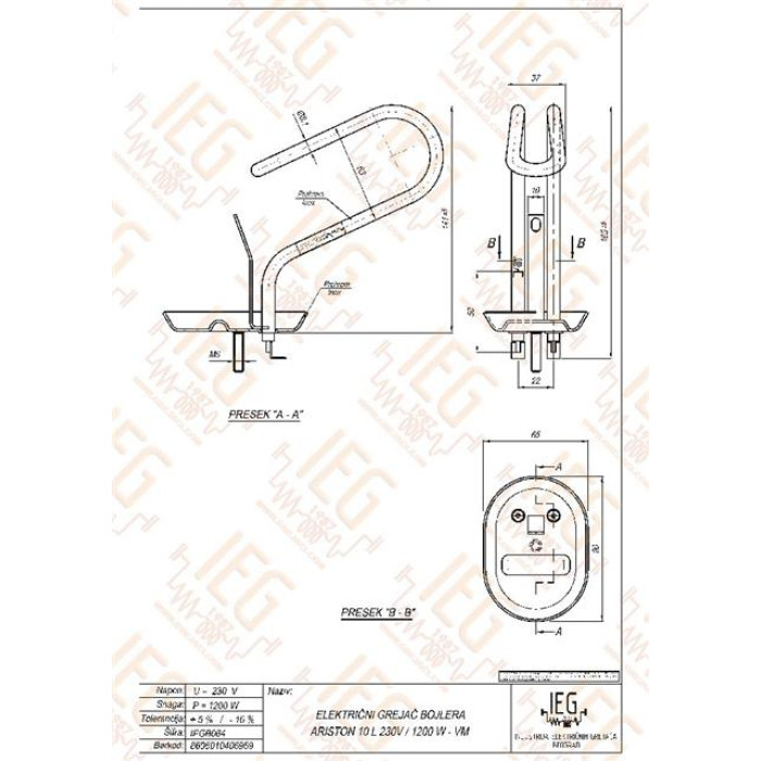 Grijač bojlera ARISTON 10 lit. VM 1,2 kW - krom