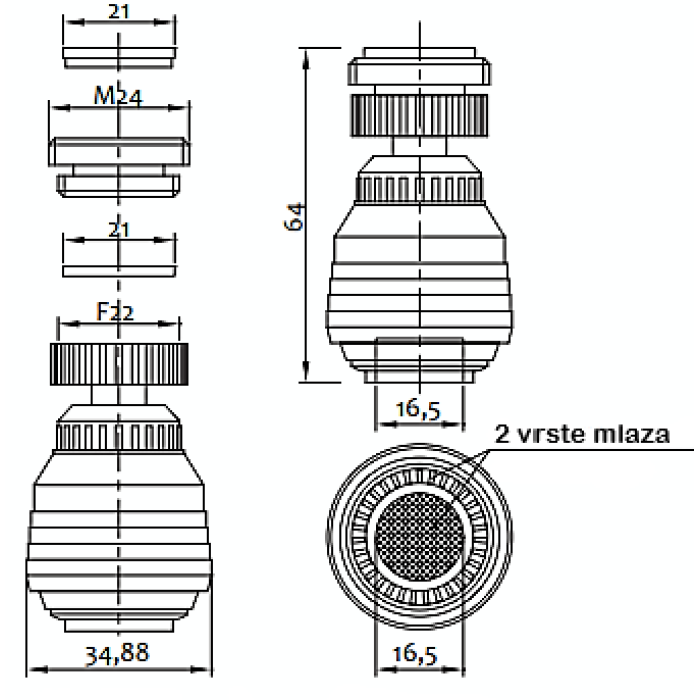 Veličina: F22/1 mm (unutrašnji navoj) sa PVC redukcijom na M24/1 (vanjski navoj)