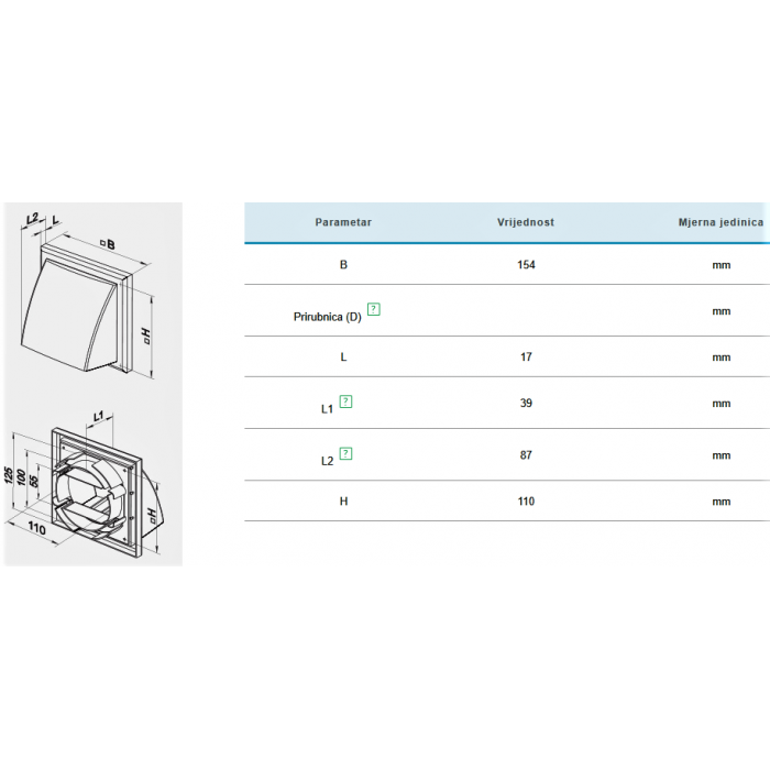 Završna rešetka za četvrtaste kanale 55x110 mm