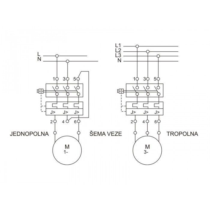 Sve motorno zaštitne sklopke su realizovane kao tropolne, ali se odgovarajućom vezom može postići da se one koriste kao jednopolne
